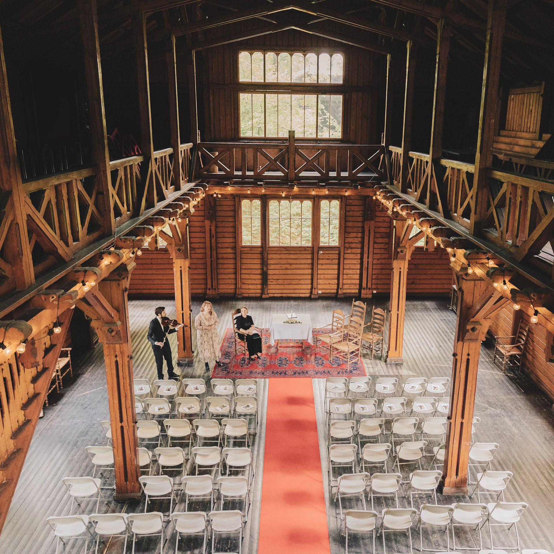 Dette kan bli virkelighet på Norsk Folkemuseum! Hele sommeren arrangerer vi bryllupfest på Gjestestuene og mange av våre brudepar vil gjerne ha en høytidelig seremoni i et vakkert lokale i nærheten. Vigselsbygget Galleri Gamle Landbruk er stort og luftig og med dobbel takhøyde. Det er plass til 120 sittende gjester og flere stående. På galleriet inne i rommet kan musikere synge for gjestene, og bryllupsfotografen kan følge seremonien tett uten å være i veien.