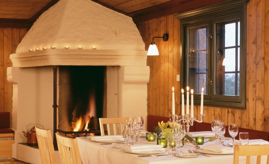 Folkestuen er et hyggelig rom med plass til mellom 25 og 40 gjester. Med tømmerpanel på veggene og smårutete vinduer oppleves rommet som intimt og koselig.