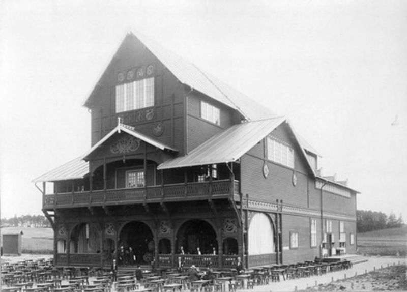 Pariserpaviljongen på museumsområdet i årene rett etter 1900. Legg merke til stolpene og rekkverket i andre etasje. Disse bygningsdelene er fortsatt i bruk i dagens selskapslokale.