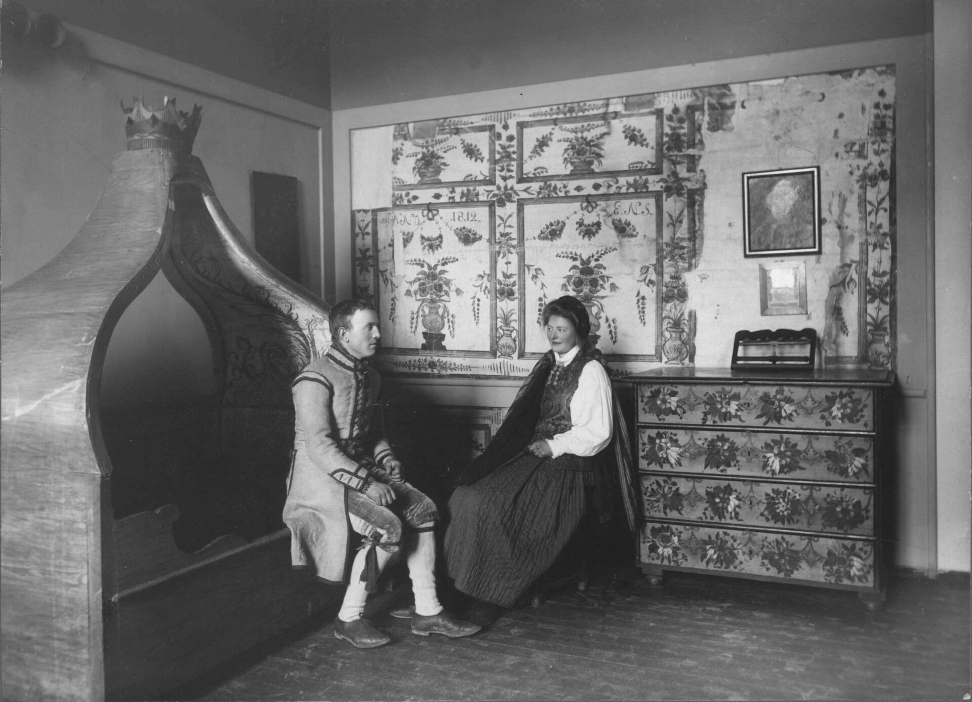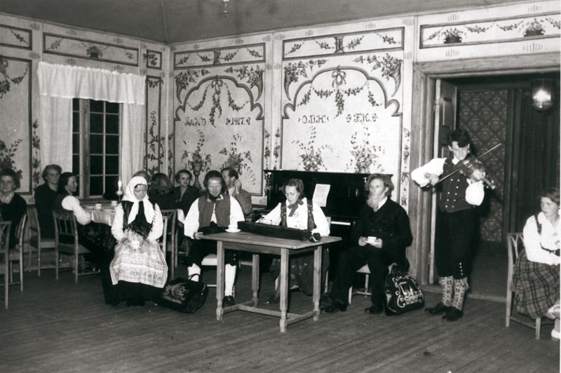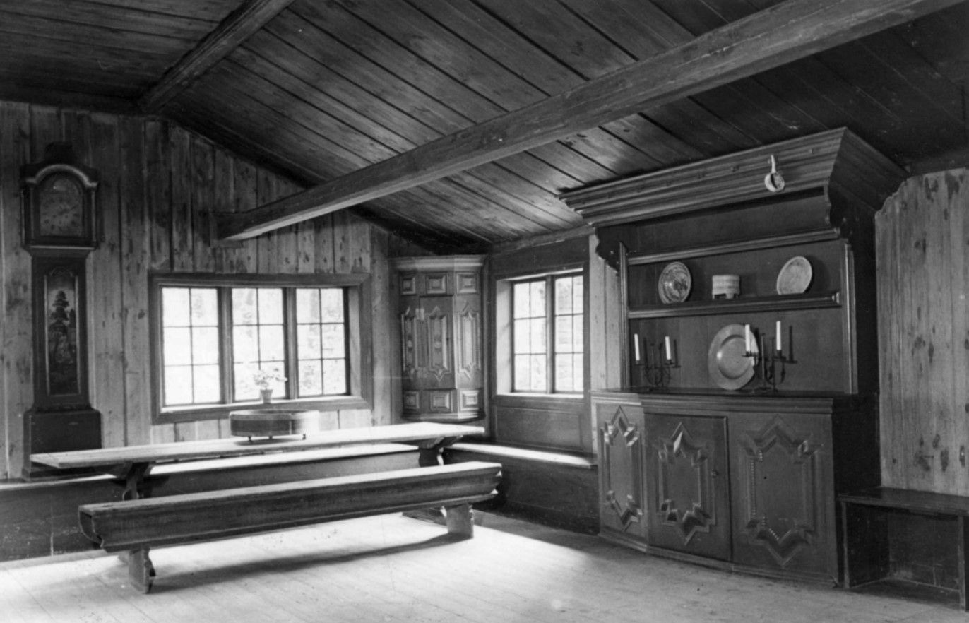 Lenge visste museet ikke hvor inspirasjon til tapetene i Festsalen kom fra, men antok at de kom fra en storgård i Dalarne i Sverige. Vinteren 2008 fant imidlertid to av våre konservatorer deler av originaltapetene som ble brukt som forbilde til veggdekorasjonene i Festsalen. Disse ble funnet i et av museets magasiner, med opplysning om at tapetene var fra Høland i Akershus og med en opprinnelse fra 1812. Til høyre ses dette fragmentet fra en tidlig montasje med tidsriktige figurer i bildet.
